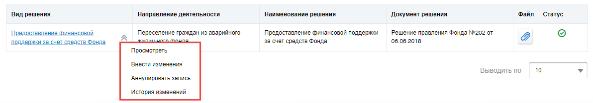 Для аннулирования решения Фонда по направлению деятельности выберите пункт контекстного меню размещенного решения Аннулировать запись.