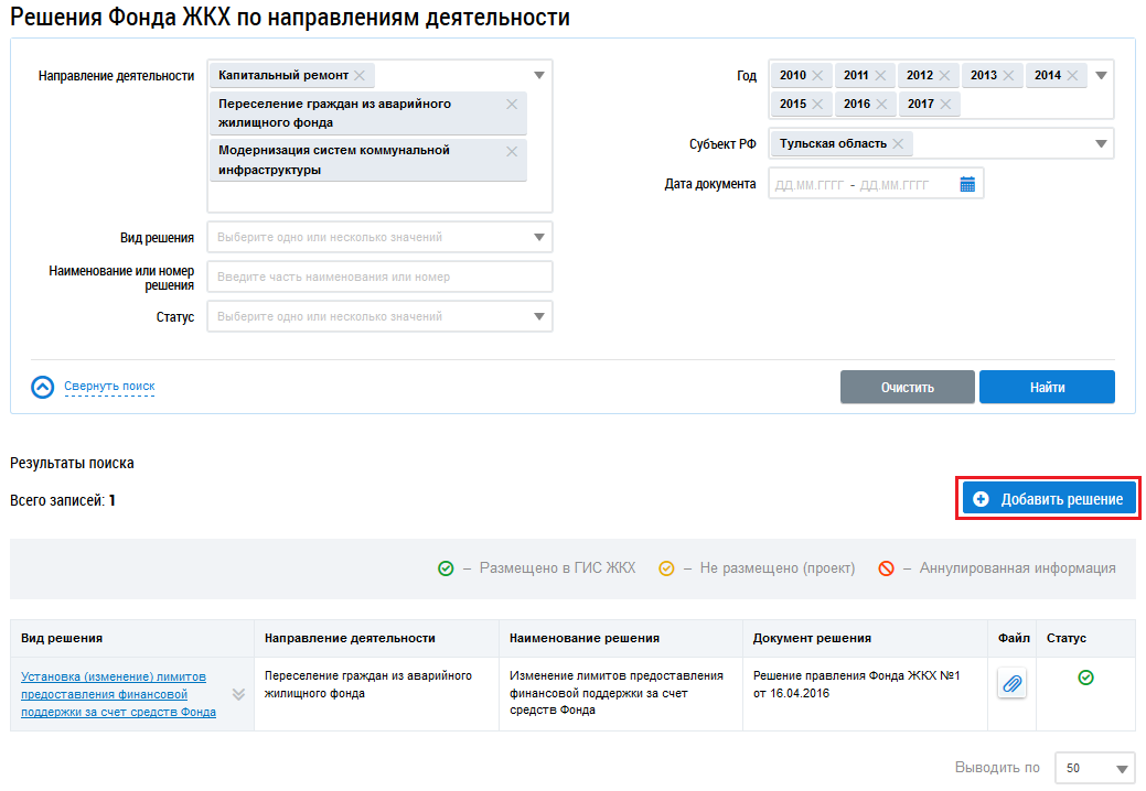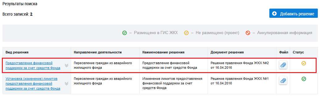 Для создания решения Фонда по направлению деятельности нажмите на кнопку Добавить решение на странице Решения Фонда ЖКХ по направлениям деятельности.
