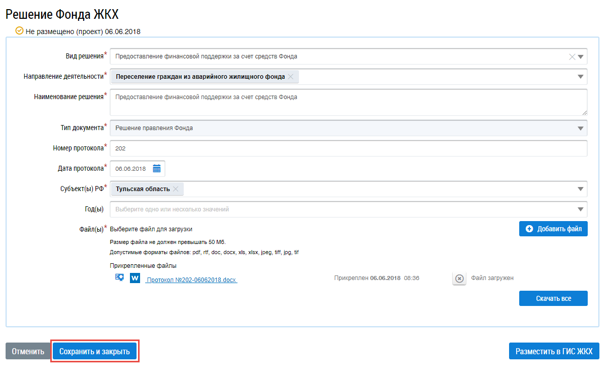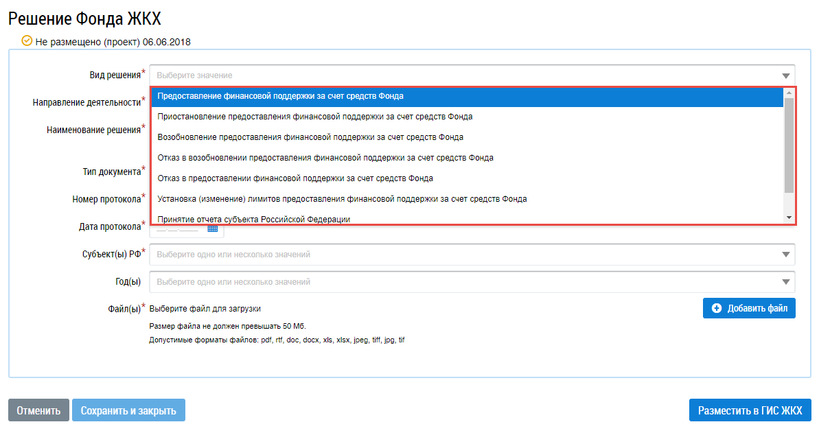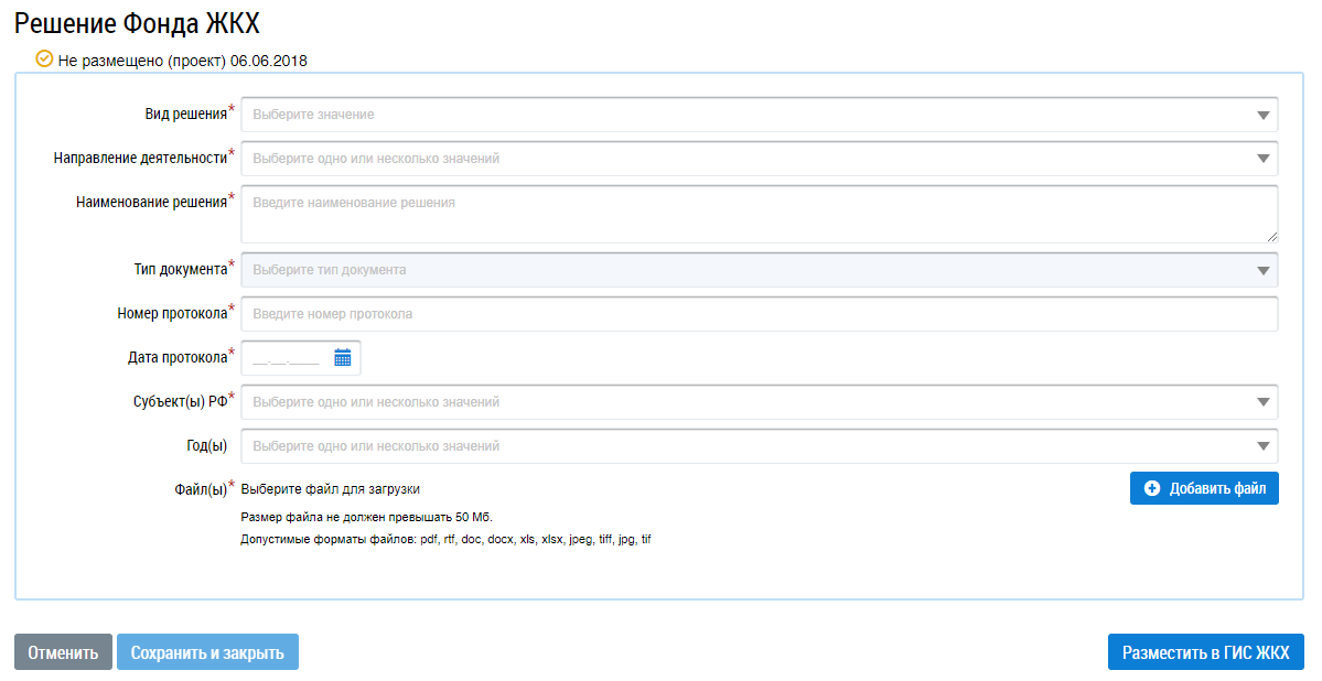 Отображается страница создания Решения Фонда ЖКХ.