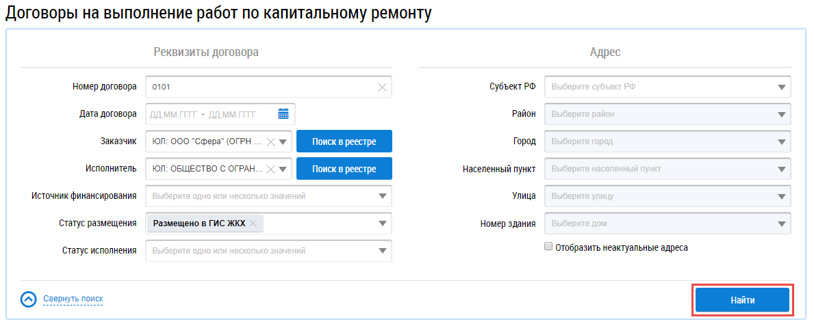 Для поиска договоров на выполнение работ по капитальному ремонту введите параметры поиска в блоки Реквизиты договора и Адрес (Страница «Договоры на выполнение работ по капитальному ремонту»).