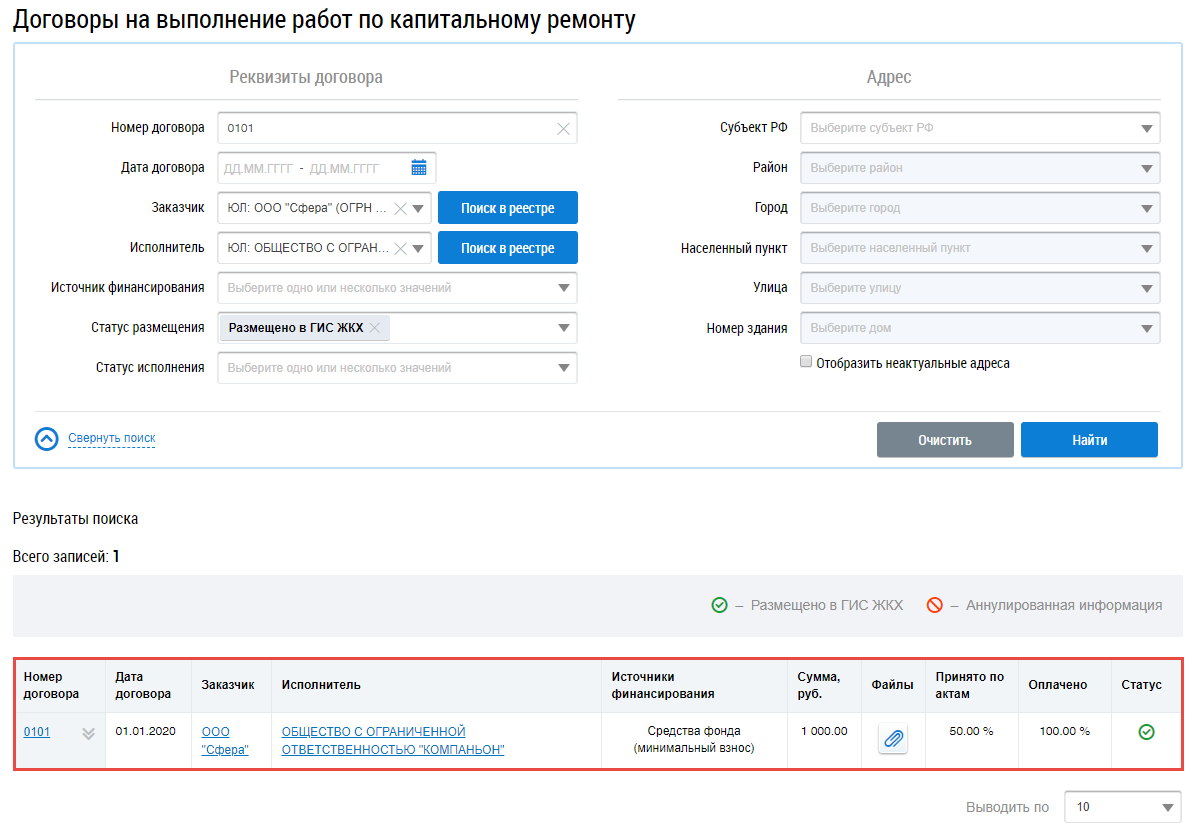 В блоке Результаты поиска отображаются договоры, соответствующие введенным параметрам.