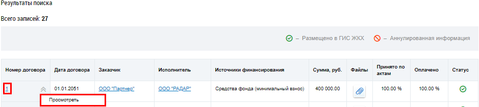 Для просмотра договора на выполнение работ по капитальному ремонту выберите пункт контекстного меню договора Просмотреть или нажмите на гиперссылку с номером договора.