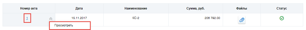 Для просмотра акта выберите пункт контекстного меню акта Просмотреть или нажмите на гиперссылку с номером акта.