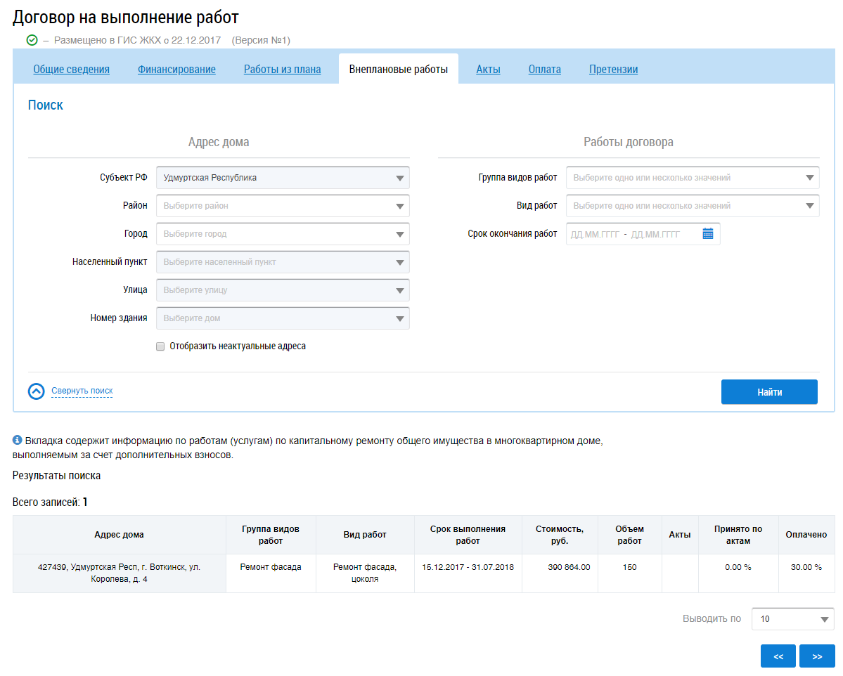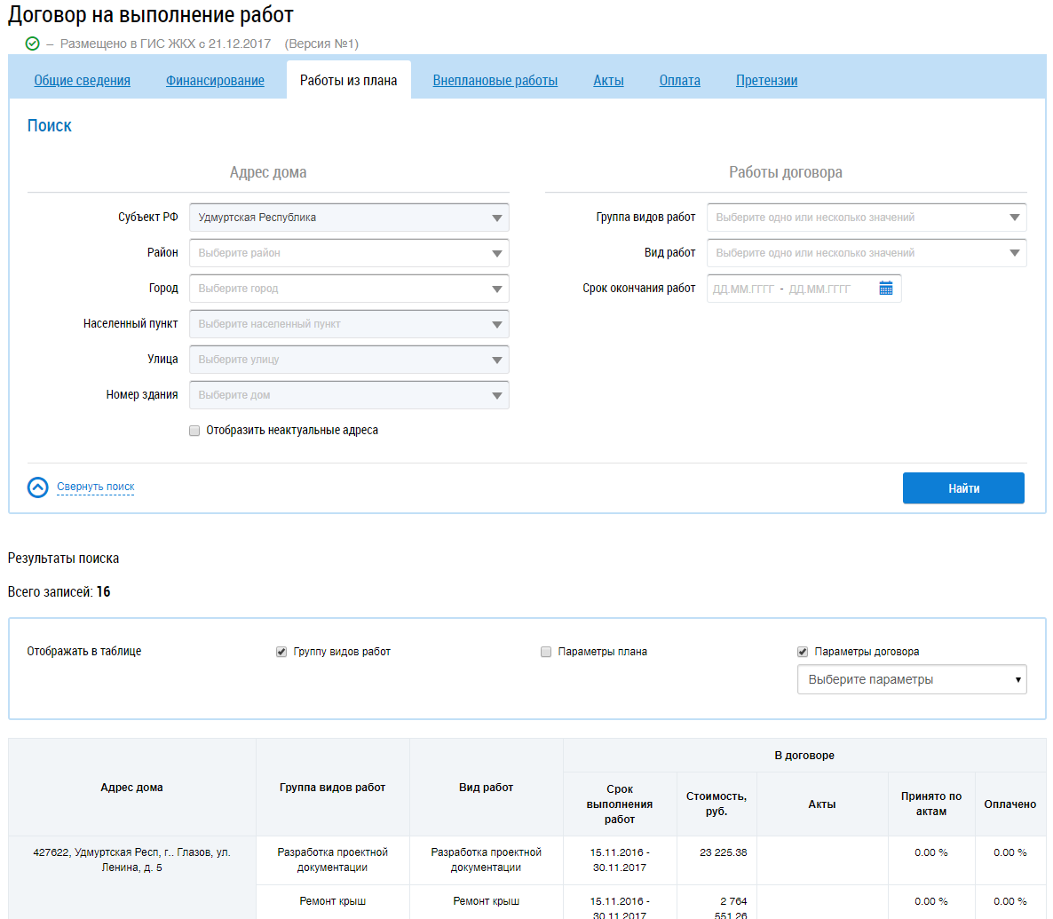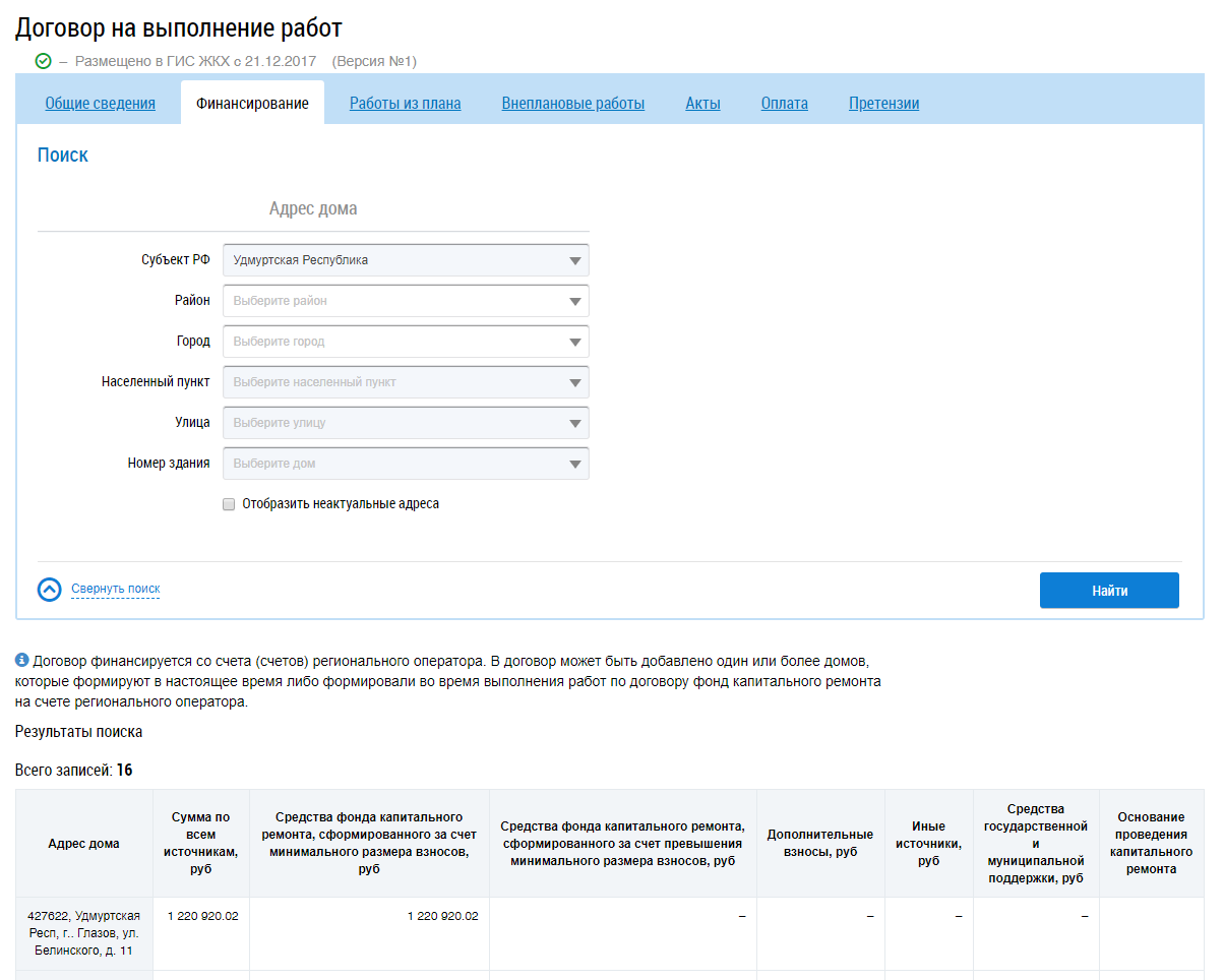 Для поиска работ заполните блоки Адрес дома и Работы договора и нажмите на кнопку Найти. В результатах поиска отображаются соответствующие введенным параметрам работы.