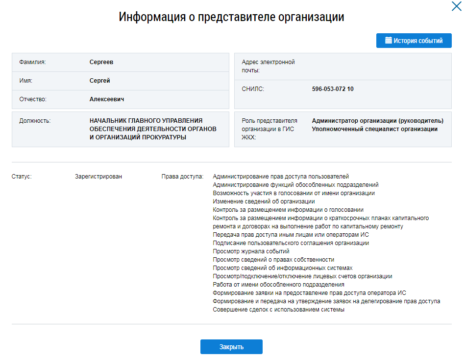 Отображается окно Информация о представителе организации с общей информацией о представителе организации.