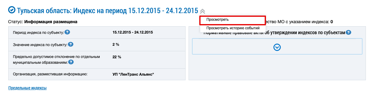 Для просмотра индексов по субъекту выберите пункт контекстного меню Просмотреть.