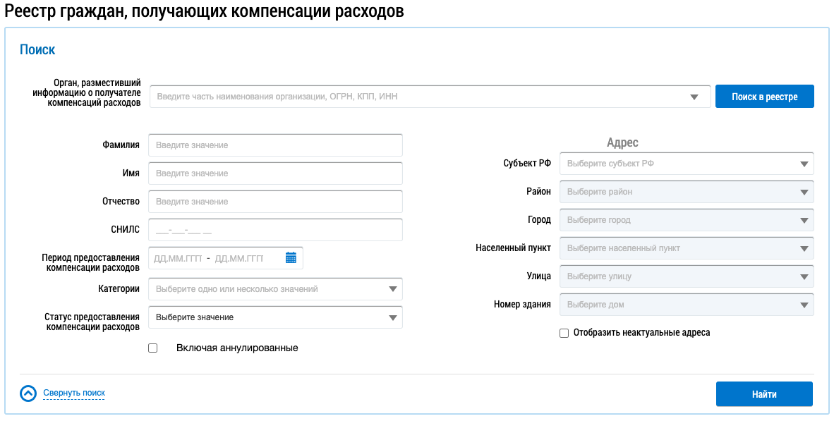 Страница Реестр граждан, получающих компенсации расходов содержит блок поиска, блок результатов поиска.
