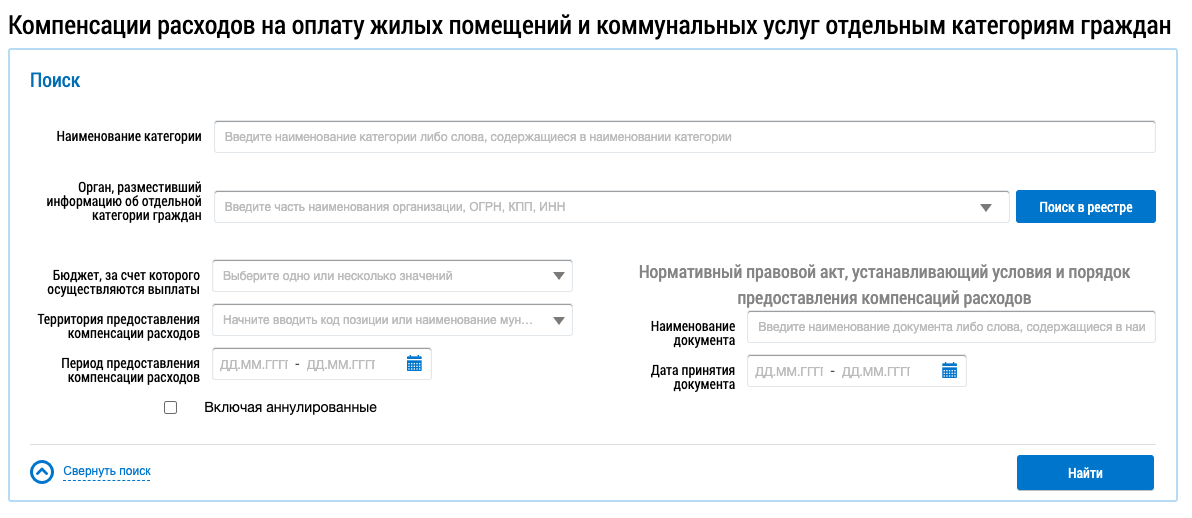 Страница Компенсации расходов на оплату жилых помещений и коммунальных услуг отдельным категориям граждан содержит блок поиска, блок результатов поиска, кнопки: Очистить, Найти.