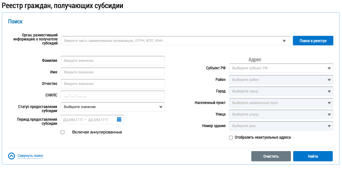 Отображается страница Реестр граждан, получающих субсидии.