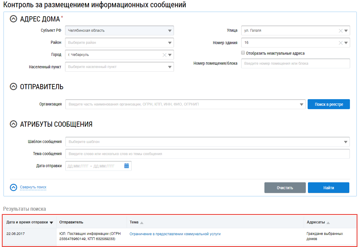 Для поиска информационных сообщений необходимо обязательно заполнить блок Адрес дома до уровня дома. Для заполнения поля Отправитель нажмите на кнопку Поиск в реестре. Для заполнения блока Атрибуты сообщения в поле Шаблон сообщения, выбрав значение из выпадающего списка, введите тему сообщения и дату отправки. Проверьте корректность введенных данных и нажмите на кнопку Найти.