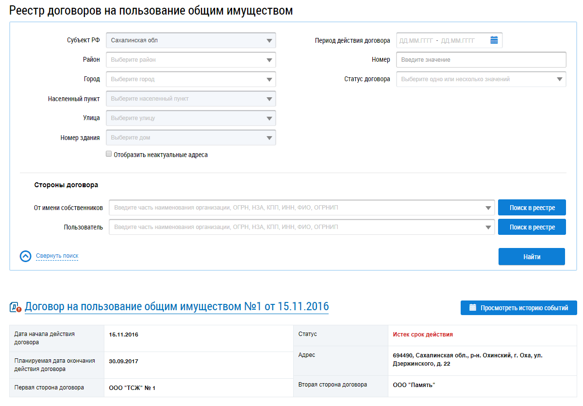 Данный раздел доступен после предоставления представителю организации права доступа «Контроль за размещением информации о договорах на пользование общим имуществом». Для получения необходимых прав обратитесь к Администратору организации.