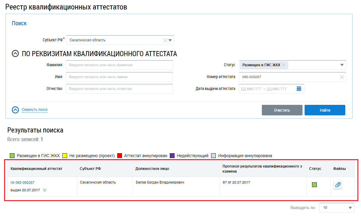 Квалификационный аттестат, соответствующий введенным параметрам поиска, отображается в блоке Результаты поиска.