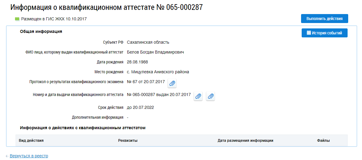 Отображается страница просмотра информации о квалификационном аттестате.