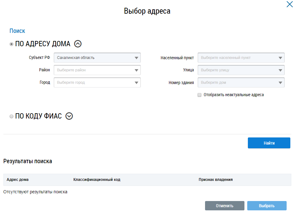 Введите параметры поиска в блоке По адресу дома либо По коду ФИАС и нажмите на кнопку Найти. Установите переключатель напротив интересующего вас адреса в блоке результатов поиска и нажмите на кнопку Выбрать.