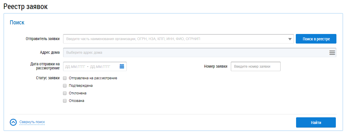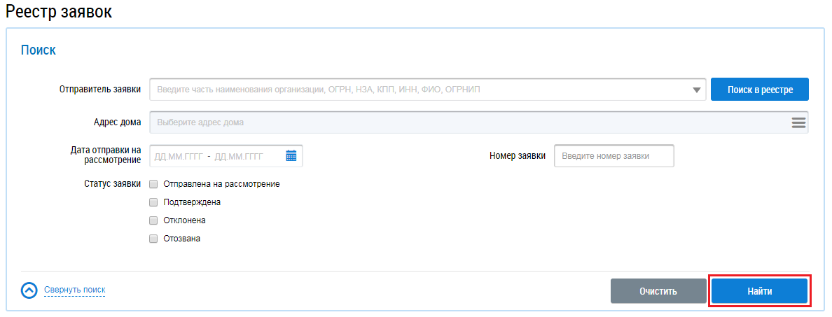 Установите флажки в поле Статус заявки и нажмите на кнопку Найти.