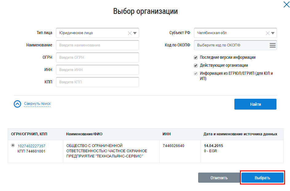 В отобразившемся окне Выбор организации воспользуйтесь блоком поиска, затем установите переключатель около необходимой организации и нажмите на кнопку Выбрать.
