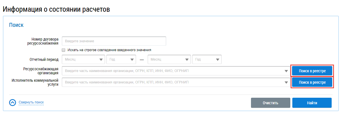 В блоке поиска введите номер договора ресурсоснабжения. Для осуществления поиска информации, необходимо выбрать Ресурсоснабжающую организацию или Исполнителя коммунальных услуг, нажав на кнопку Поиск в реестре.