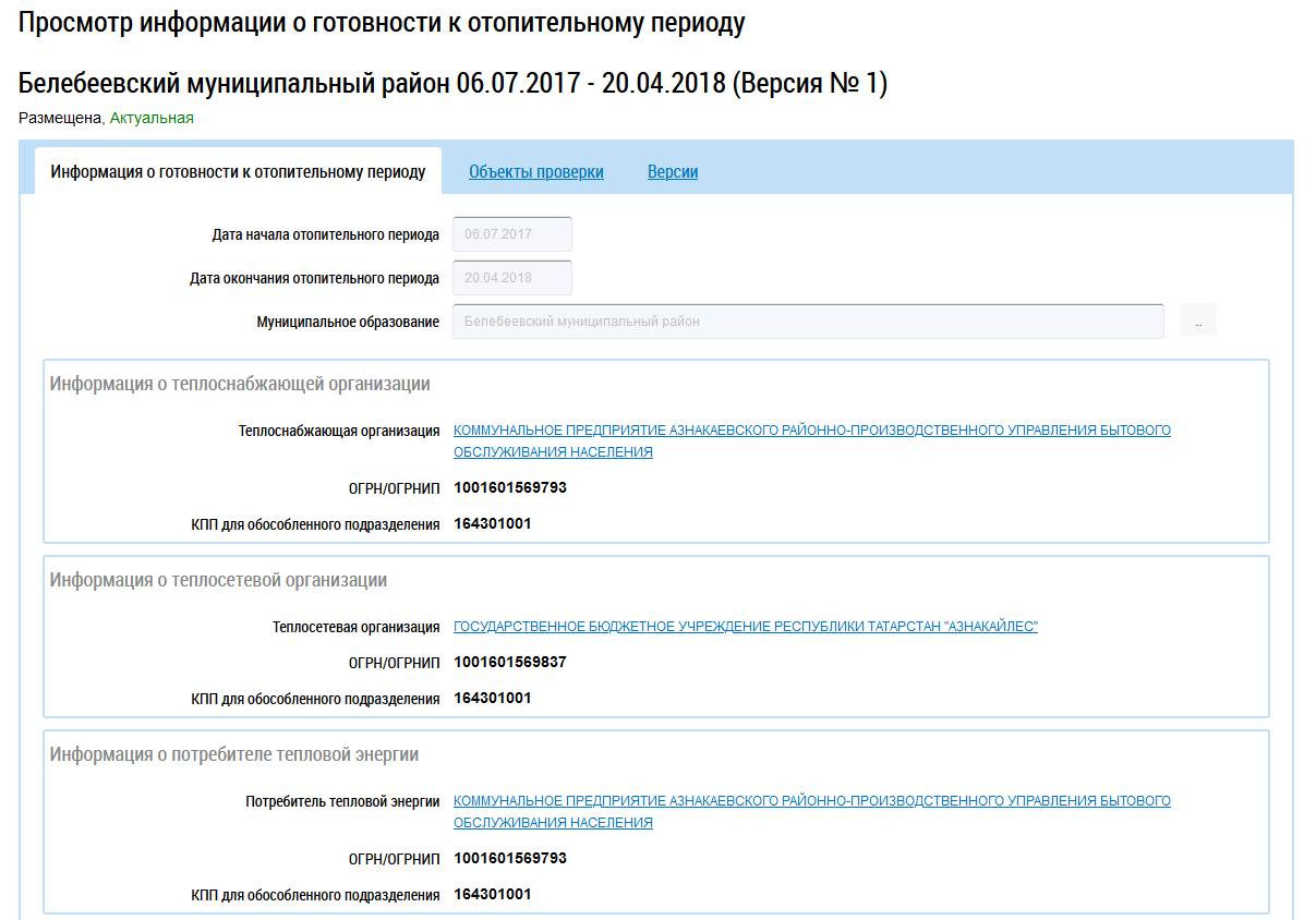 Рис. 1. Страница просмотра информации о готовности к отопительному периоду