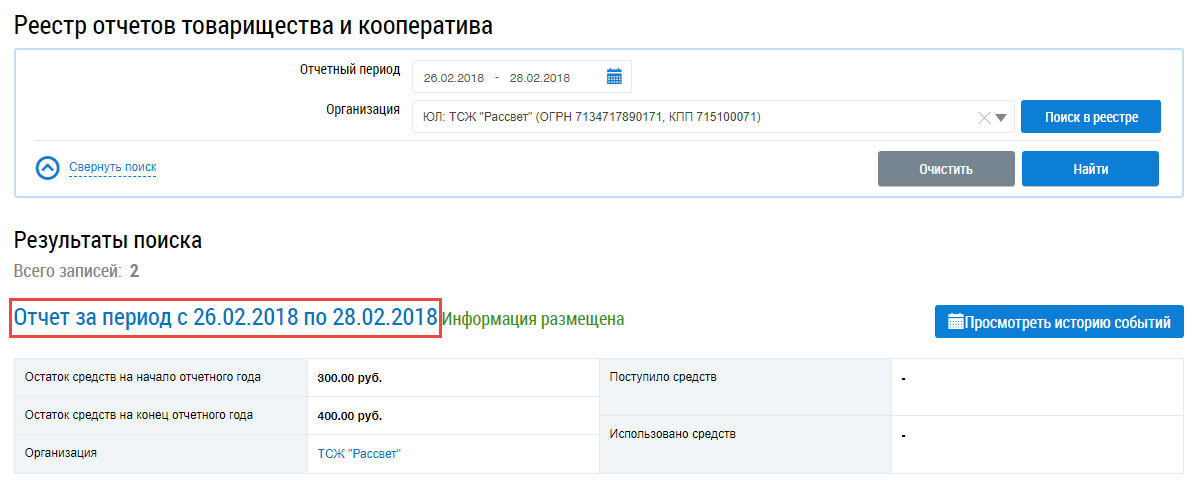 Возможность просмотра доступна для документов в статусе Информация размещена. Для просмотра отчета выберите нужный отчет в блоке результатов поиска реестра отчетов товарищества и кооператива и нажмите на гиперссылку с периодом отчета.