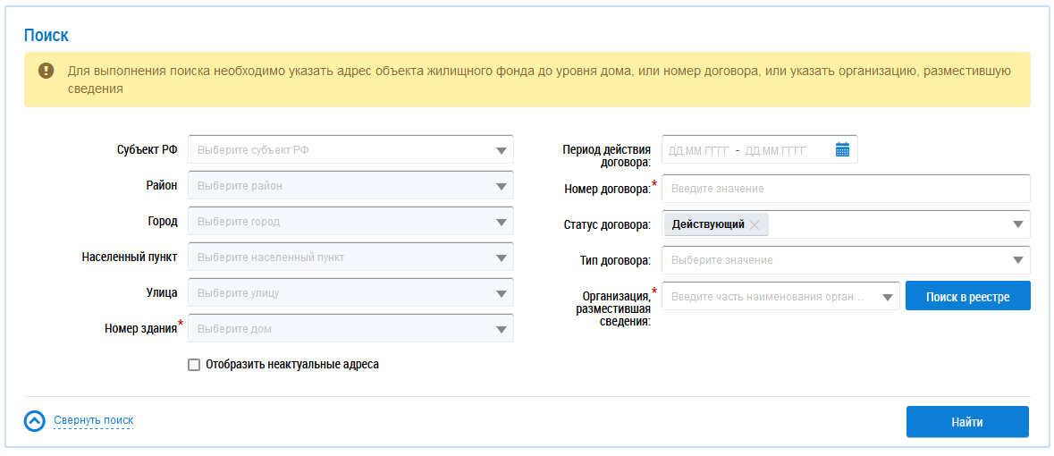 Для поиска по реестру заполните поля блока поиска. Чем точнее задан поисковый запрос, тем уже выборка результатов. Поля, отмеченные знаком «*», обязательны для заполнения. Нажмите на кнопку Найти для осуществления поиска.