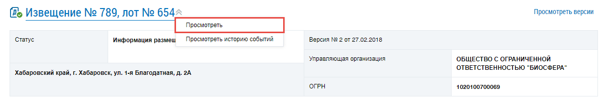 Для просмотра информации о проведении открытого конкурса по отбору управляющей организации в целях заключения договора управления МКД нажмите на гиперссылку с номером извещения или выберите пункт контекстного меню Просмотреть.