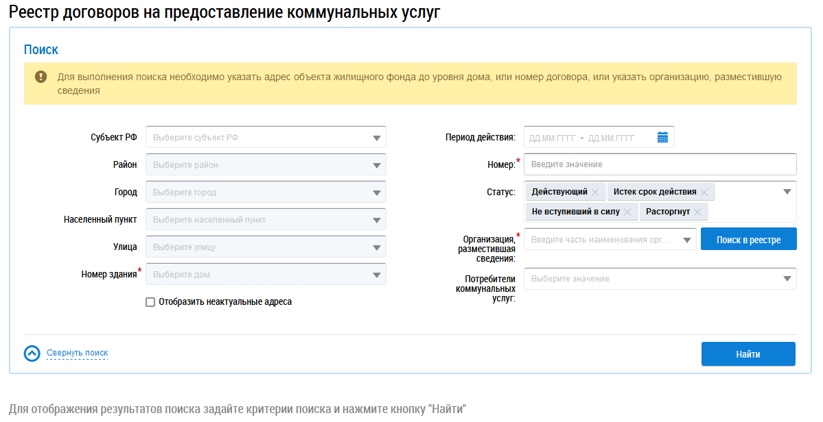 Для перехода на страницу Реестр договоров на предоставление коммунальных услуг нажмите на соответствующую гиперссылку на странице Контроль за размещением информации. Отображается страница Реестр договоров на предоставление коммунальных услуг.
