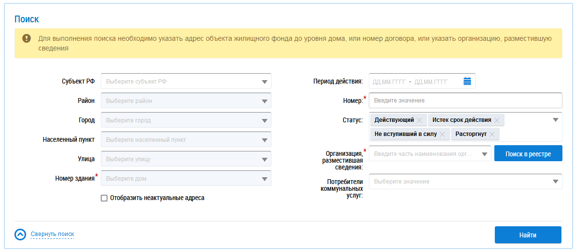Для поиска по реестру заполните поля блока поиска. Чем точнее задан поисковый запрос, тем уже выборка результатов. Поля, отмеченные знаком «*», обязательны для заполнения. Нажмите на кнопку Найти для осуществления поиска.