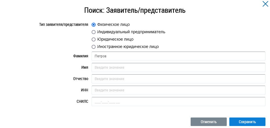 При помощи переключателя выберите тип заявителя/представителя. Заполните прочие поля формы и нажмите на кнопку Сохранить. Отображается блок поиска.