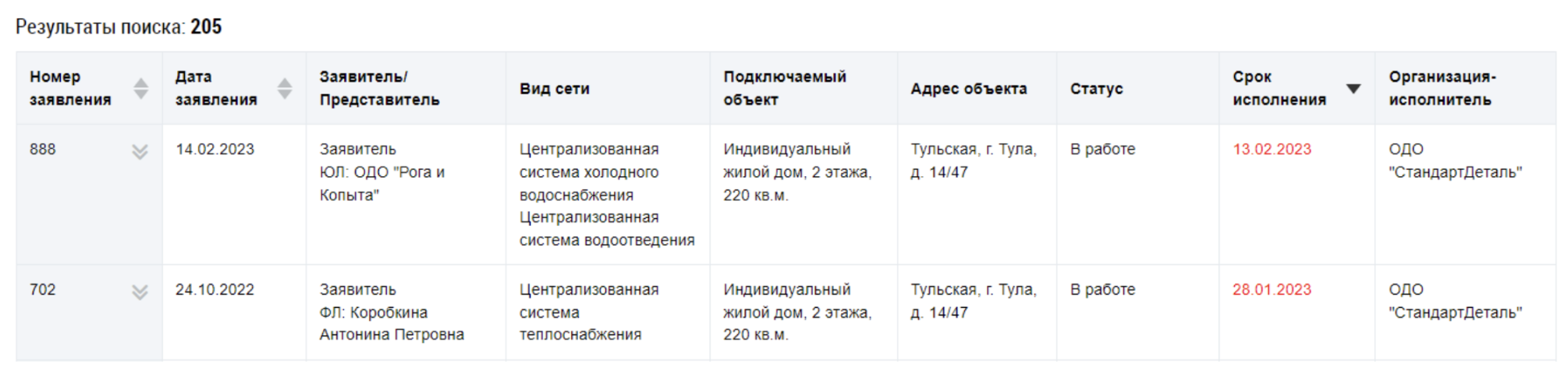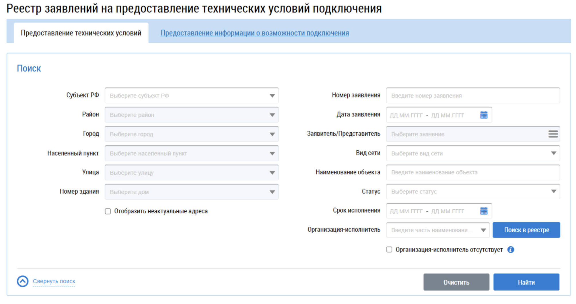 Для поиска заявлений на предоставление технических условий подключения заполните одно или несколько полей блока поиска. Чем точнее будет составлен поисковый запрос, тем уже будет выборка результатов.