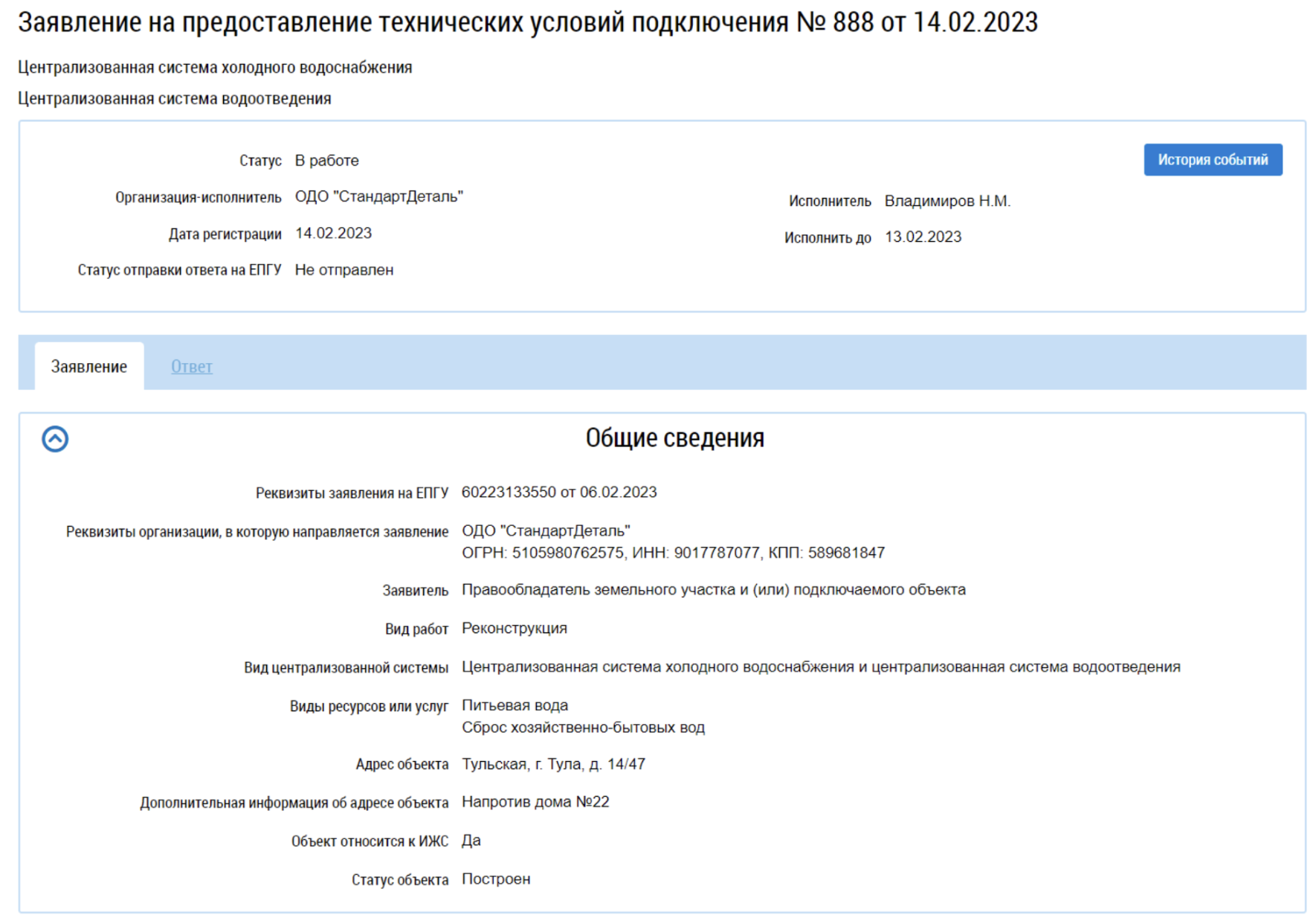 При открытии на просмотр заявлений в статусах В работе (добавлен ответ) и Отправлен ответ для просмотра доступна вкладка Ответ.