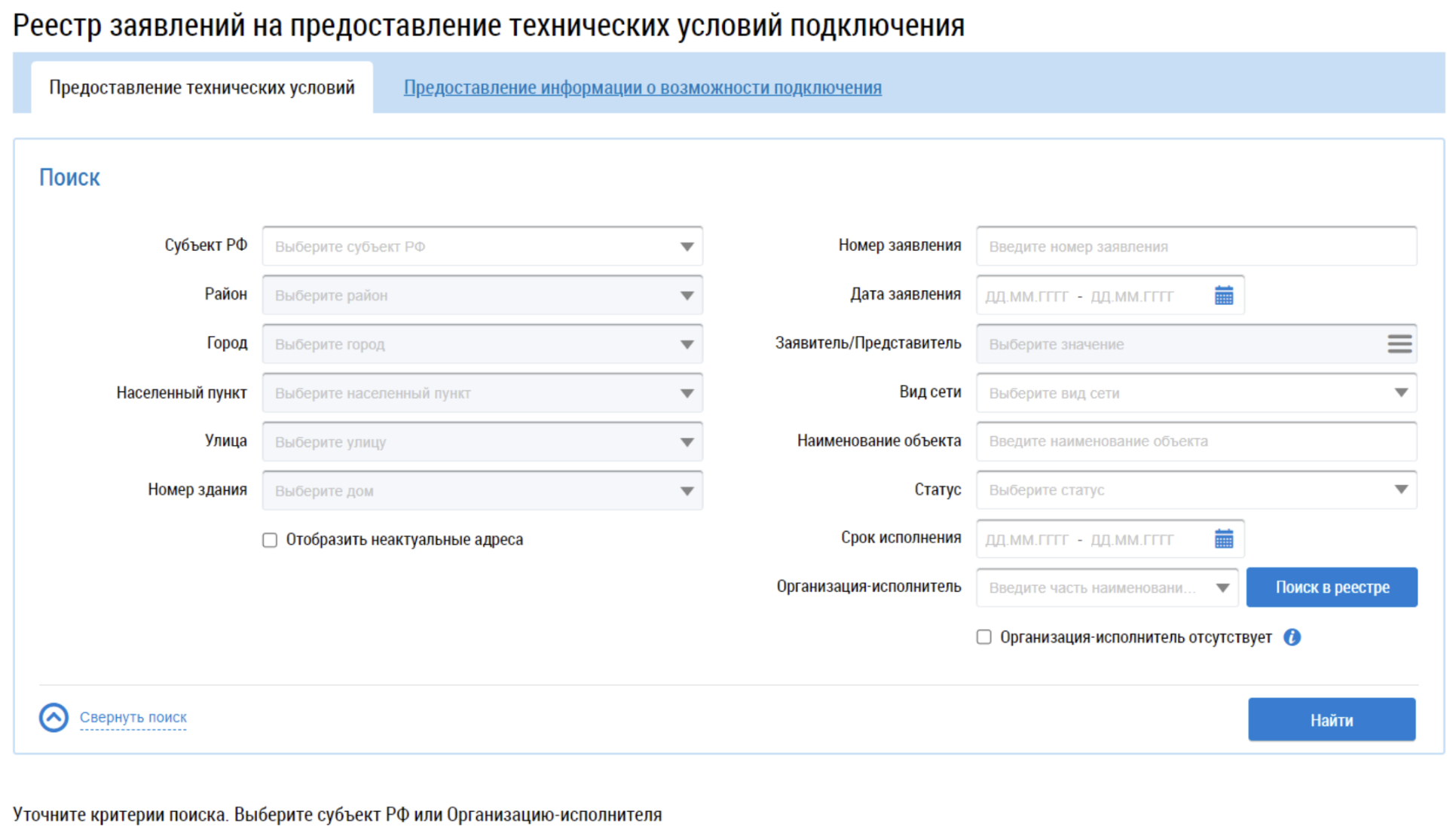 Реестр заявлений на предоставление технических условий подключения