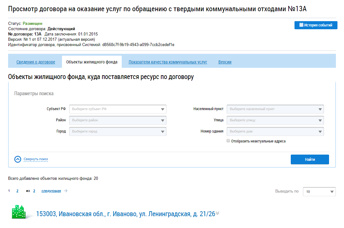 Для просмотра перечня объектов, которым по данному договору оказывается услуга по обращению с ТКО, перейдите на вкладку Объекты жилищного фонда.
