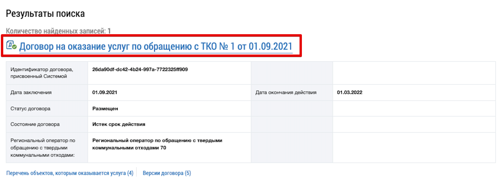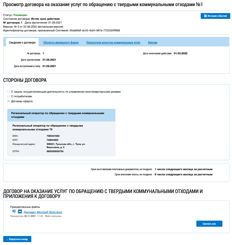 Для просмотра определенной версии договора нажмите на гиперссылку с ее номером. На новой странице отобразится информация о ранее размещенном договоре на оказание услуг по обращению с ТКО.