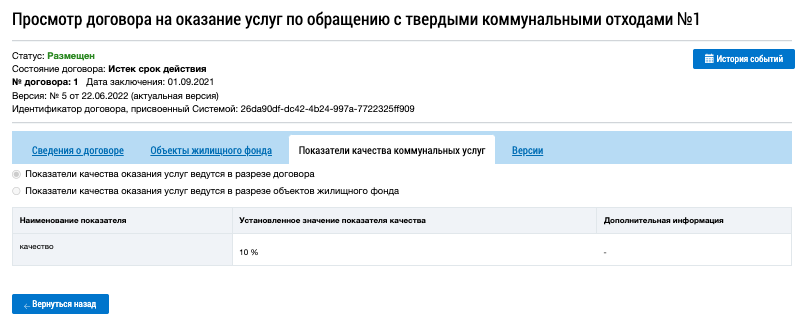 Для просмотра истории событий по договору нажмите на кнопку История событий на странице Реестр договоров на оказание услуг по обращению с твердыми коммунальными отходами, либо нажмите на кнопку История событий на странице Просмотр договора на оказание услуг по обращению с твердыми коммунальными отходами.