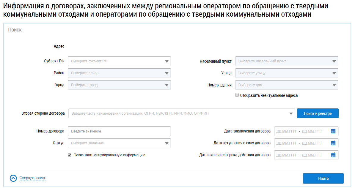 Для осуществления поиска договора с оператором по обращению с твердыми коммунальными отходами заполните одно или несколько полей блока поиска.