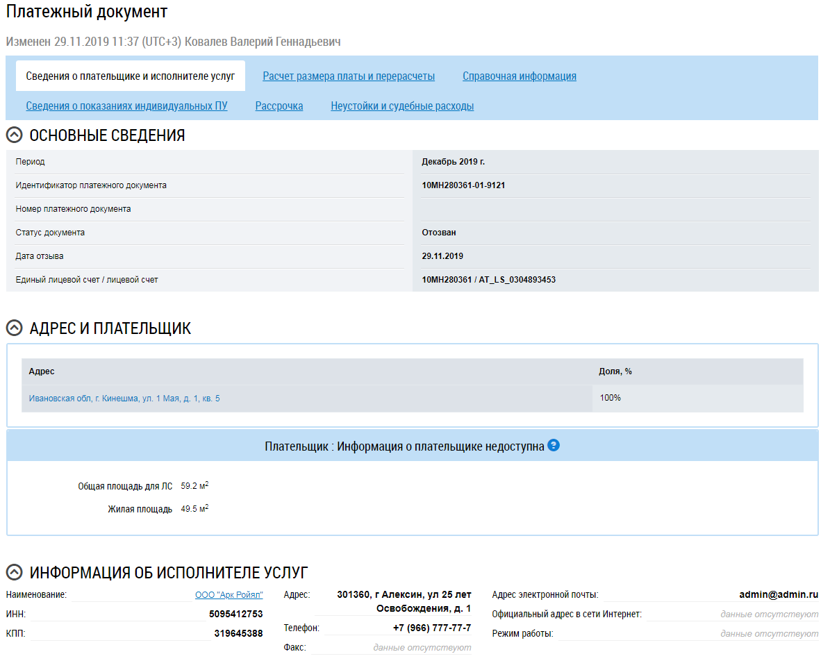 Отображается страница со сведениями о платежном документе на вкладке Сведения о плательщике и исполнителе услуг.