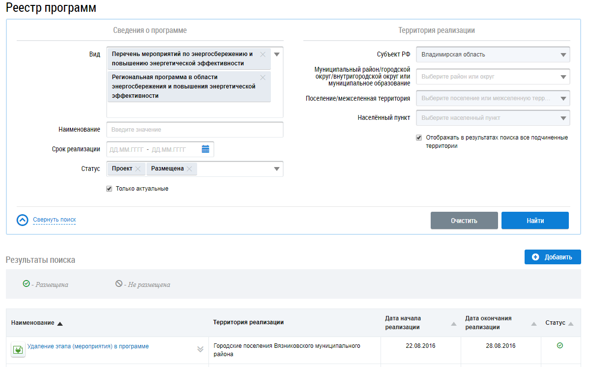 Отображается страница Реестр программ.