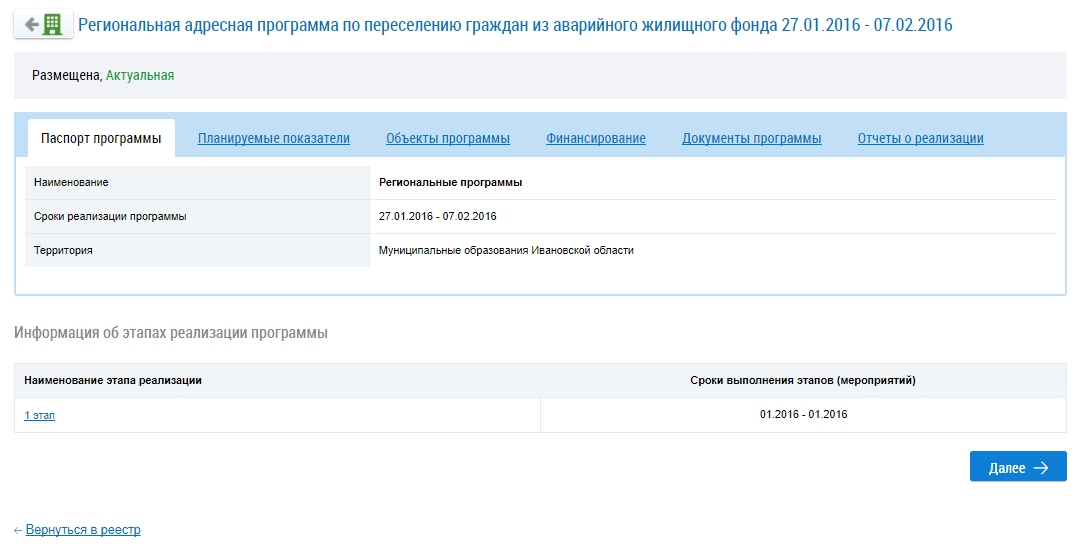 Для просмотра информации о планируемых показателях, объектах программы, финансировании, документах программы, отчетах о реализации перейдите на соответствующие вкладки с помощью кнопки Далее.