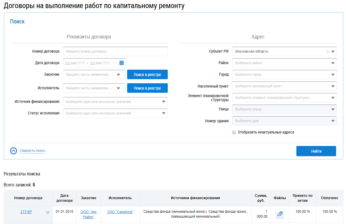 Отображается страница Договоры на выполнение работ по капитальному ремонту.