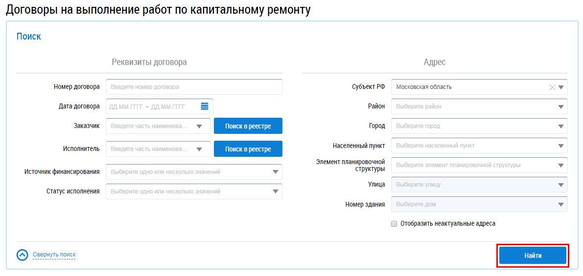 Для поиска договоров на выполнение работ по капитальному ремонту введите параметры поиска в блоки Реквизиты договора и Адрес (Страница «Договоры на выполнение работ по капитальному ремонту»).