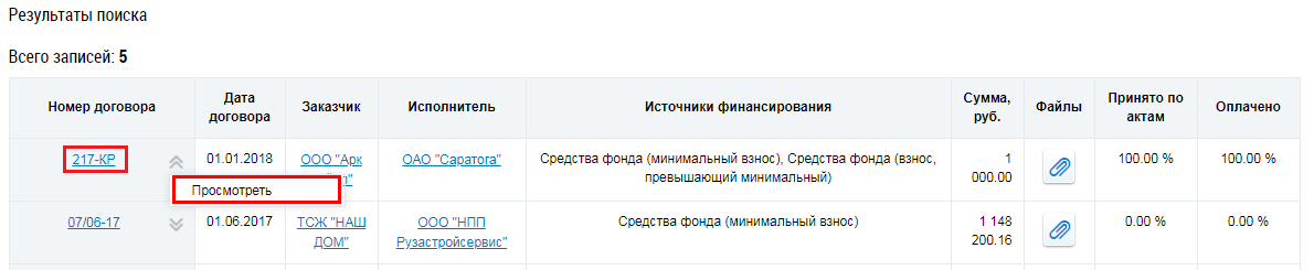 Для просмотра договора на выполнение работ по капитальному ремонту выберите пункт контекстного меню договора Просмотреть или нажмите на гиперссылку с номером договора.