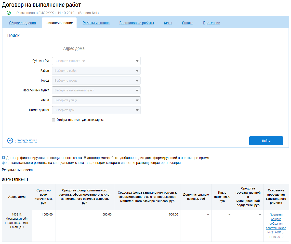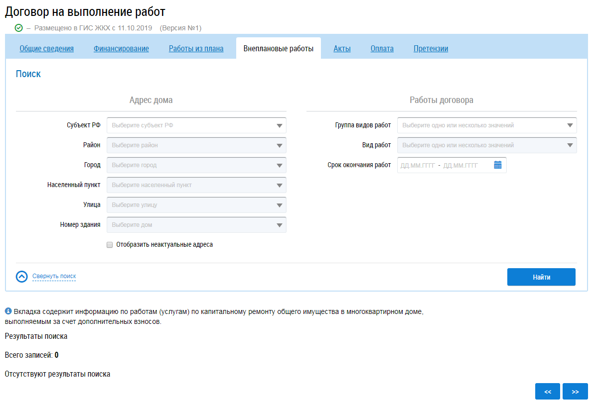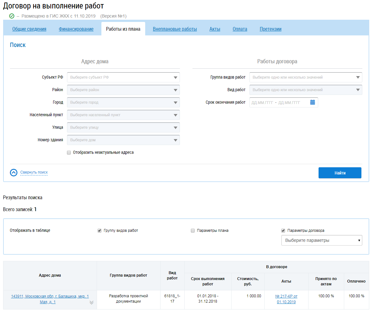 Для поиска работ заполните блоки Адрес дома и Работы договора и нажмите на кнопку Найти. В результатах поиска отображаются соответствующие введенным параметрам работы.