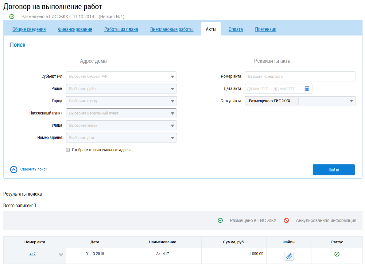 Для поиска актов заполните блоки Адрес дома и Реквизиты акта и нажмите на кнопку Найти. В результатах поиска отображаются соответствующие введенным параметрам акты.