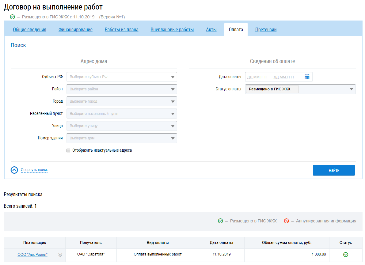 Для поиска информации об оплате заполните блоки Адрес дома и Сведения об оплате и нажмите на кнопку Найти. В результатах поиска отображаются соответствующие введенным параметрам сведения об оплате.