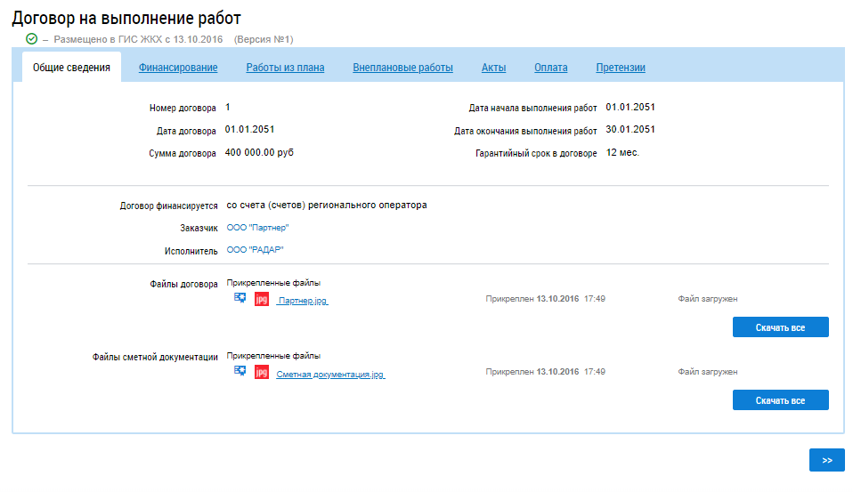 Вкладка содержит реквизиты договора, сведения заказчике и исполнителе, а также файлы договора. Для того, чтобы скачать файл договора нажмите на гиперссылку с его наименованием или на кнопку Скачать все.
