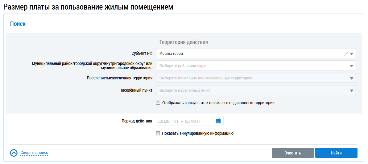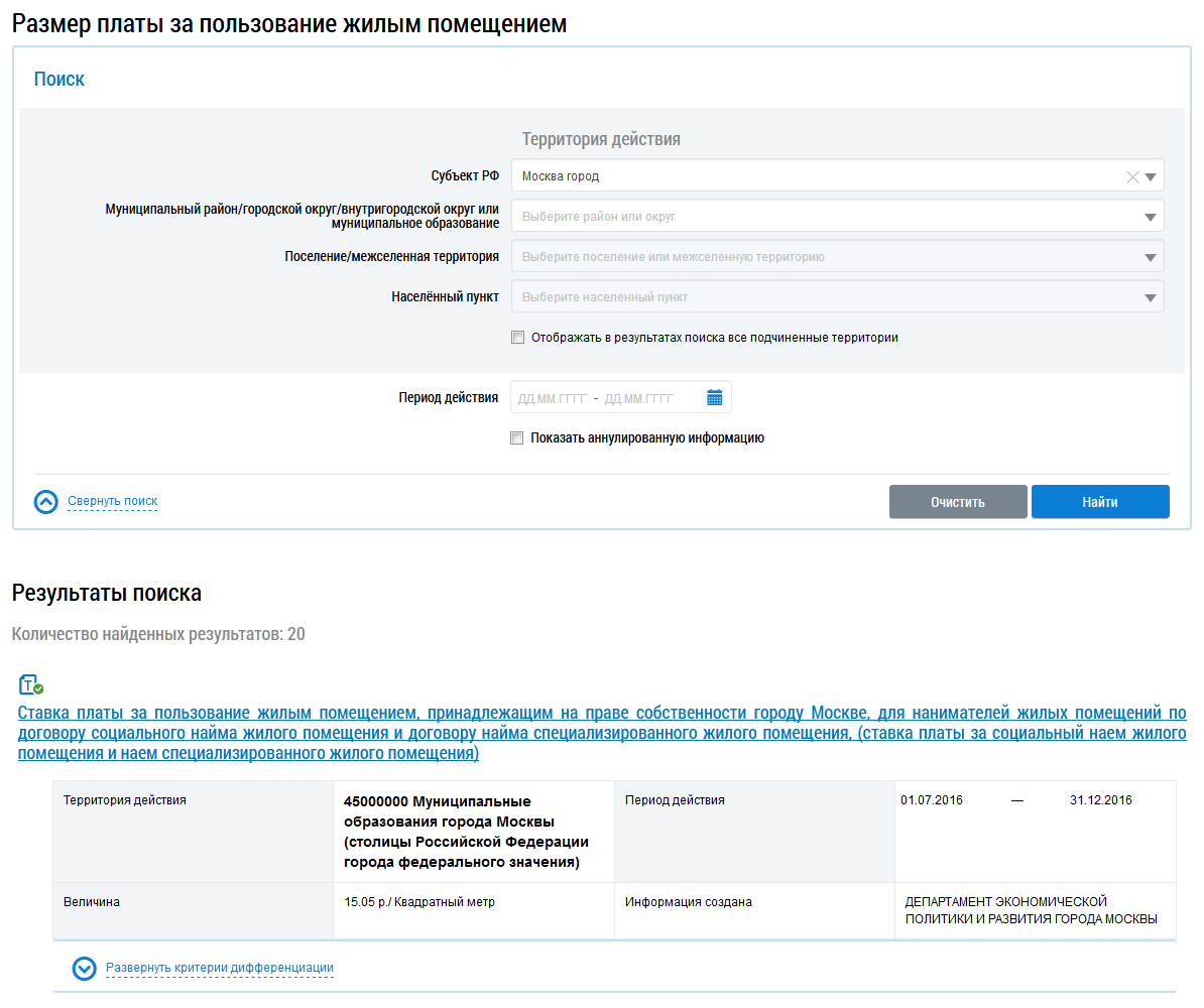 Для поиска информации о размере платы заполните одно или несколько полей блока поиска и нажмите на кнопку Найти. Чем точнее будут заданы критерии поиска, тем уже будет выборка результатов.