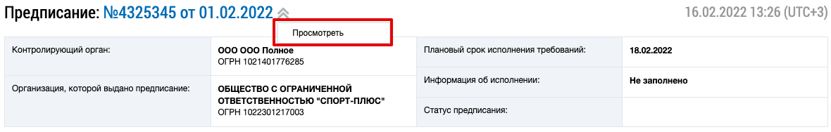 Для просмотра карточки предписания раскройте контекстное меню предписания и выберите пункт Просмотреть.