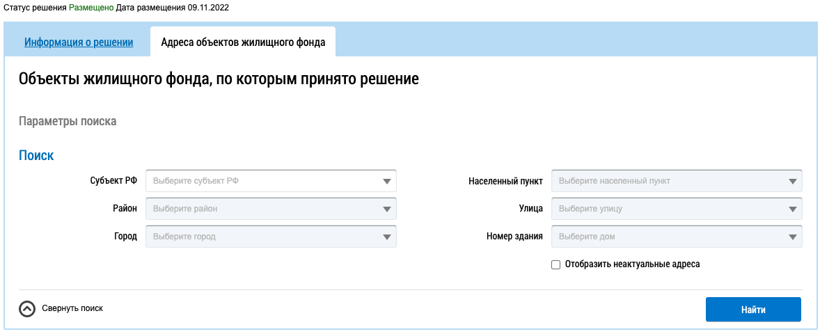 Для просмотра адресов объектов жилищного фонда, по которым принято решение, перейдите на вкладку Адреса объектов жилищного фонда.