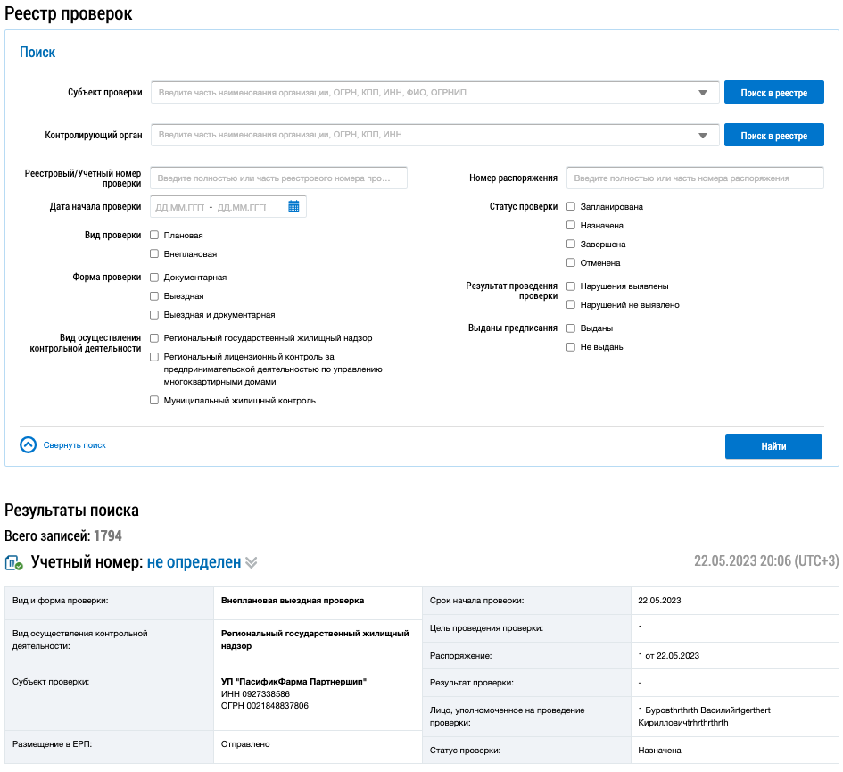 Для заполнения поля Субъект проверки нажмите на кнопку Поиск в реестре и выберите юридическое лицо или ИП из справочника.
