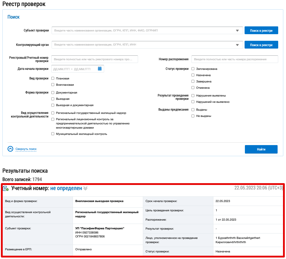 В поля Реестровый/Учетный номер проверки и Номер распоряжения введите полностью или часть реестрового номера контрольного (надзорного) мероприятия/номера распоряжения.